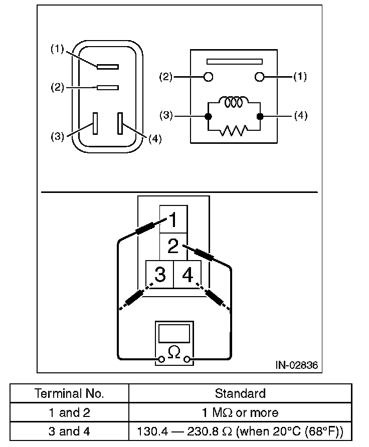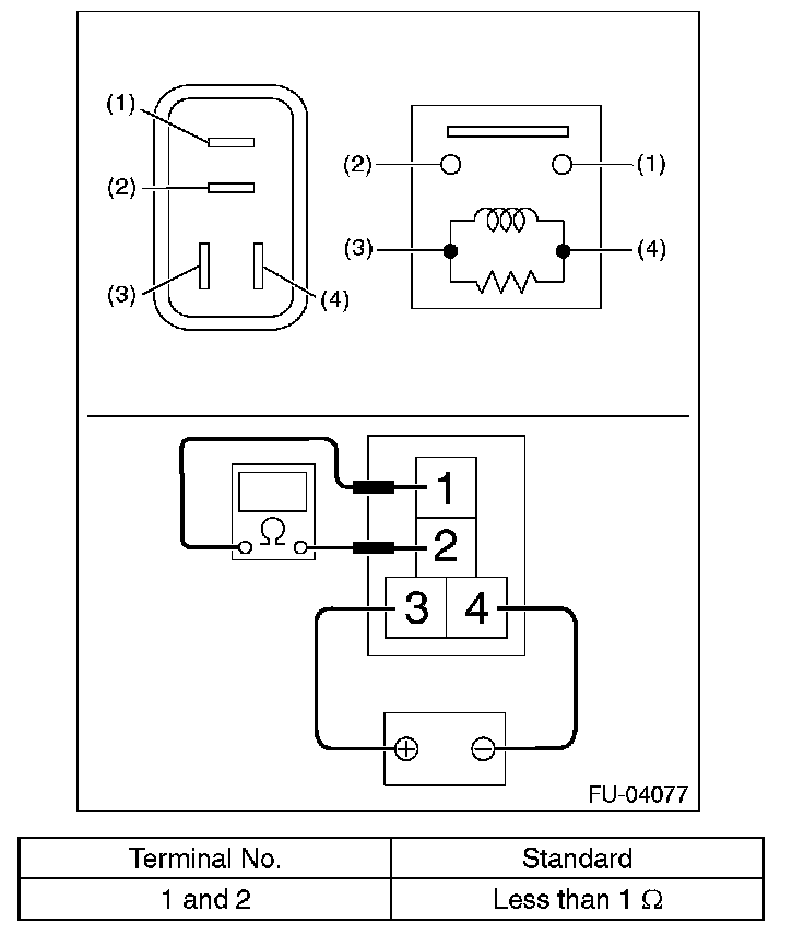 3. Connect battery positive terminal to terminal No. 3 and battery ground terminal to terminal No. 4, and measure the resistance between the main relay terminals.