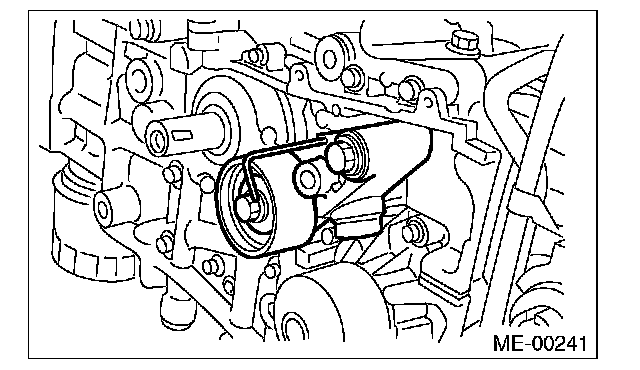 2) Check the belt tension pulley for smooth rotation. Replace the automatic belt tension adjuster assembly with a new part if abnormal noise or excessive play occurs.