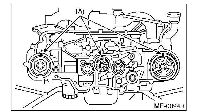 4) While aligning the alignment mark (B) on timing belt with the mark (A) on sprockets, position the timing belt properly.
