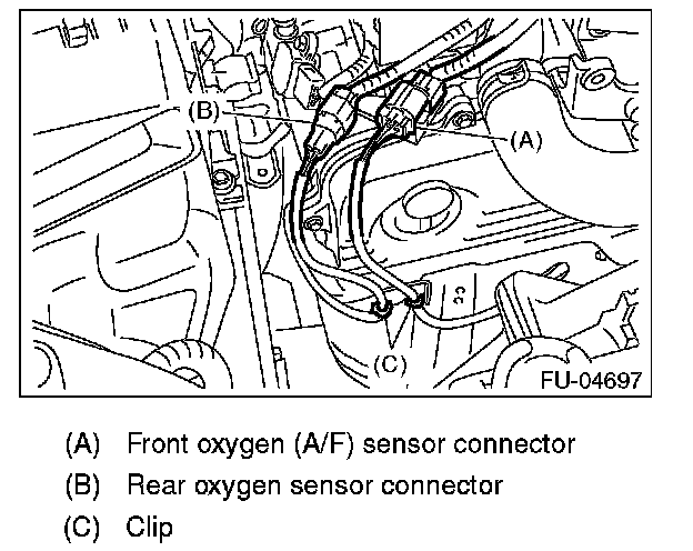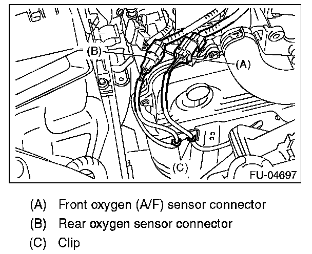 3. Disconnect the front oxygen (A/F) sensor connector, and remove the clip holding the front oxygen (A/F) sensor harness.