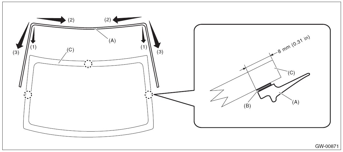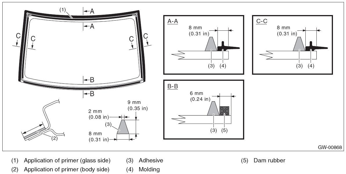 - For minimum drying time and vehicle standing time before driving after bonding, follow instructions or instruction manual from the adhesive manufacturer.