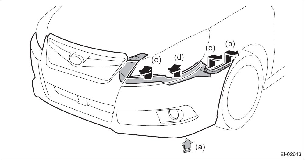 NOTE: Pushing up the lower side (a) of the fog light, remove from (b) to (e). Detach the opposite side in the same manner.