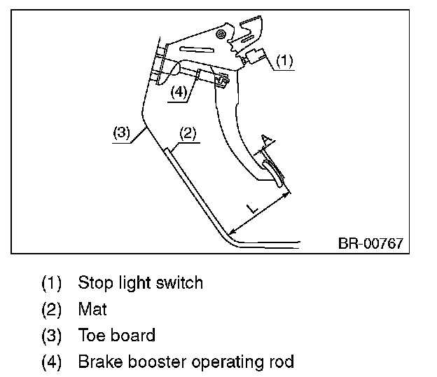 3) If it is not within the specification, loosen the lock nuts of brake booster operating rod, and rotate the rod to adjust the pedal height L within the specification.