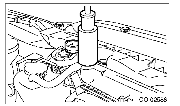 3) Remove the radiator cap, fill the radiator with engine coolant, and then install the radiator cap tester to the filler neck of radiator.