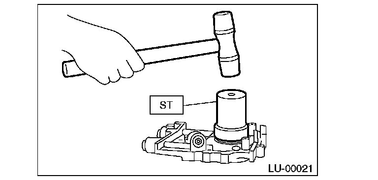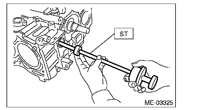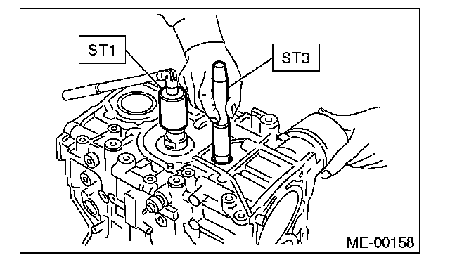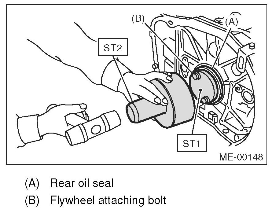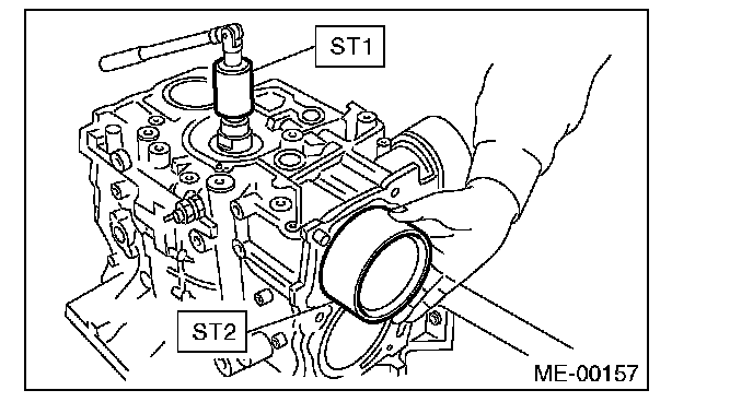 12) Apply a coat of engine oil to the oil seal inner periphery and outer periphery, and install the rear oil seal using ST1 and ST2.