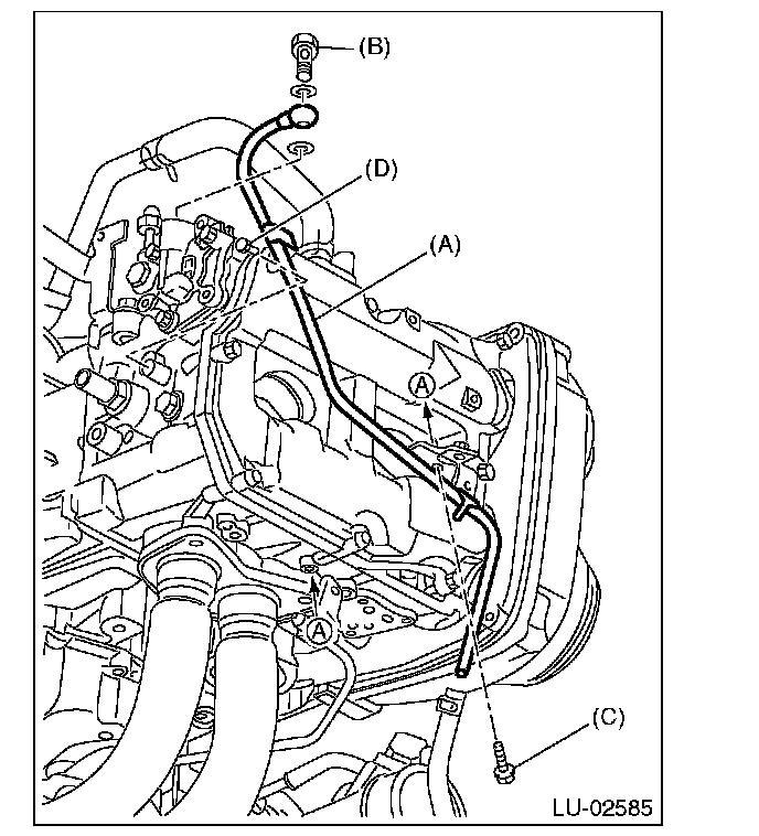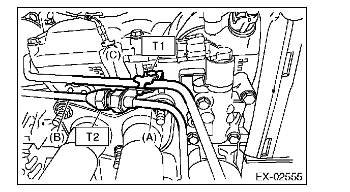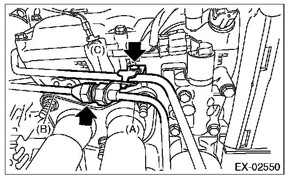 19) Install the bolt which holds oil outlet pipe (C) and oil inlet pipe A (A), and install oil inlet pipe B (B) to oil inlet pipe A (A).