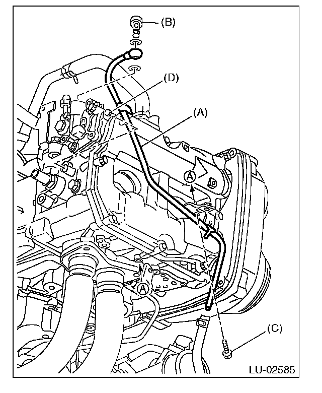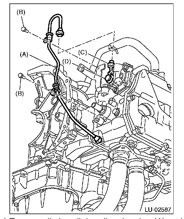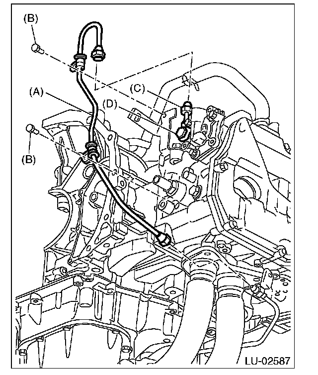16) Secure the oil outlet pipe (A) to the cylinder head and stay with bolts (C) and (D).