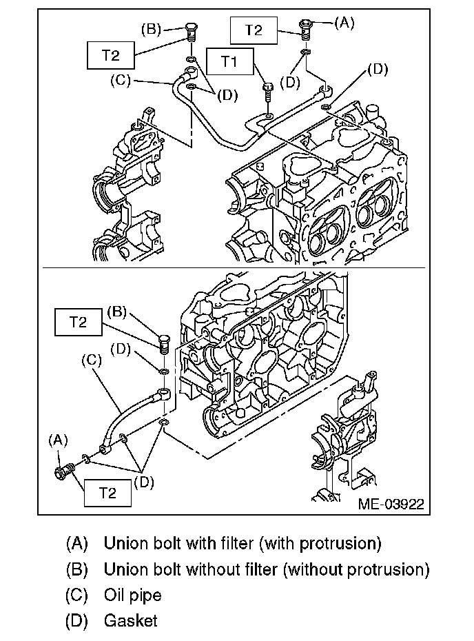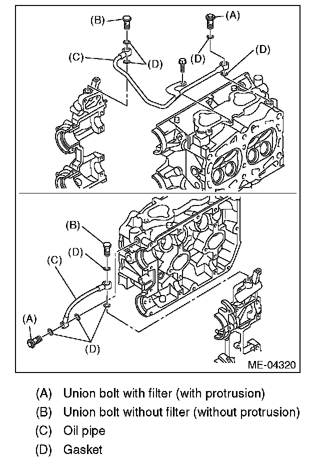 14) Remove the union bolt (D) securing the oil inlet pipe C (C) to the cylinder head, and remove the oil inlet pipe C (C).