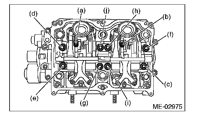 Leave two or three threads of bolts (i) and (j) engaged in order to retain the valve rocker assembly.