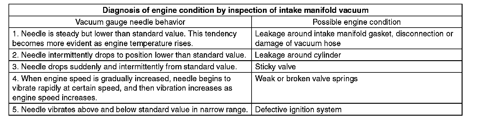 Condition of engine inside can be diagnosed by observing the behavior of the vacuum gauge needle as described in table below.