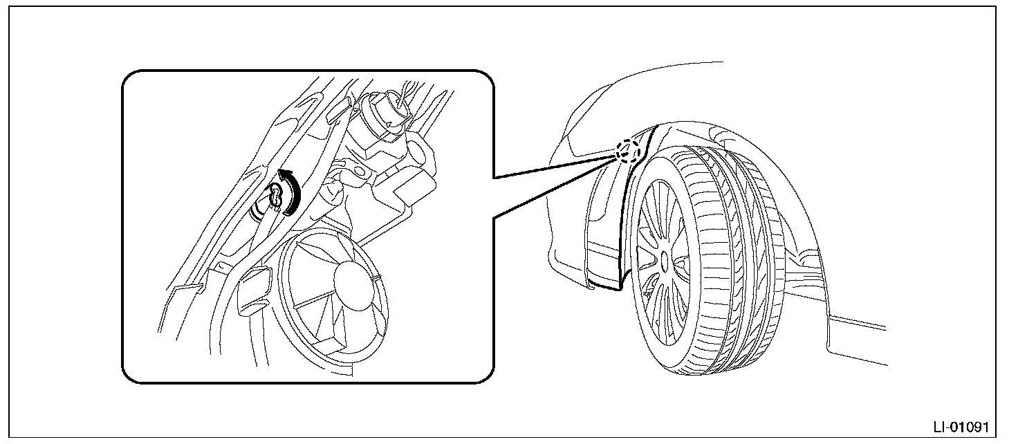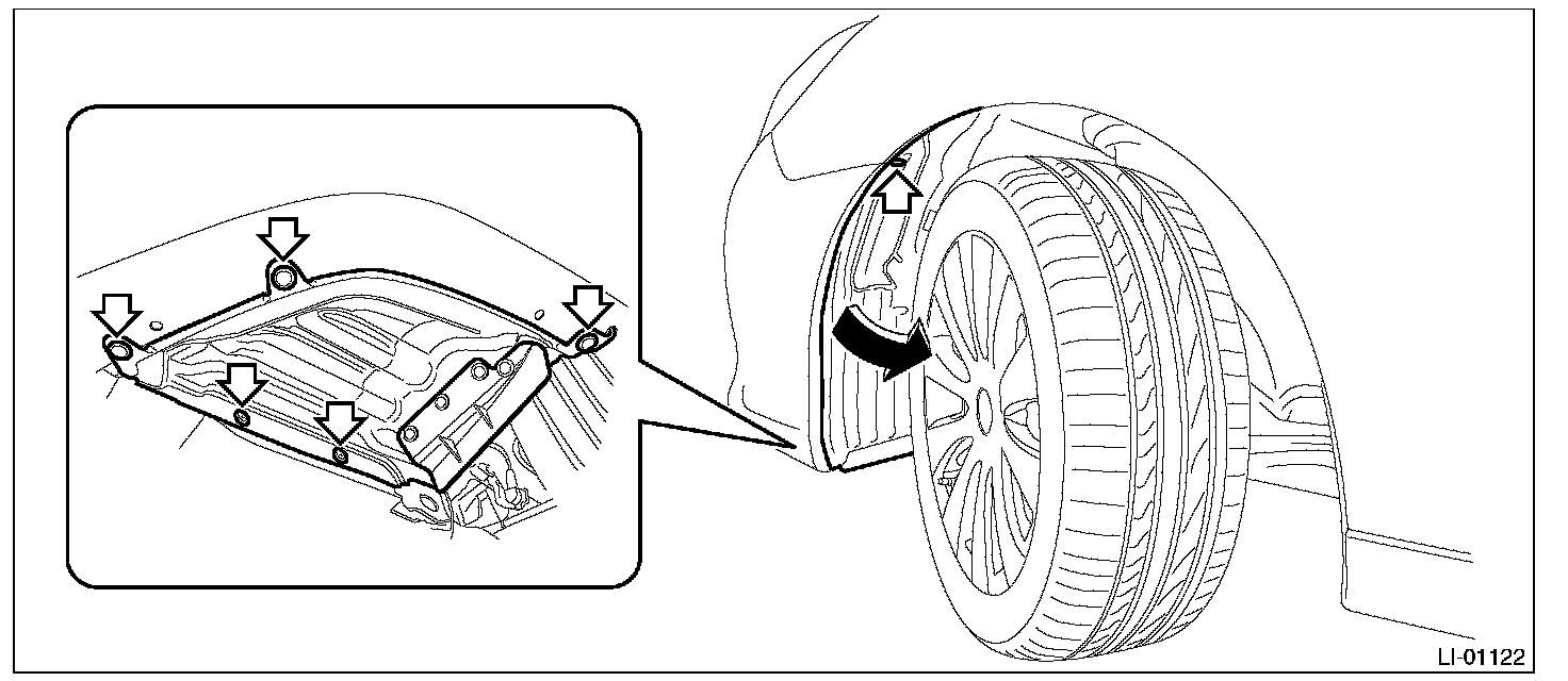 3. Turn the steering wheel in the opposite direction to the headlight to be removed. Then remove the clips and turn over the mud guard.