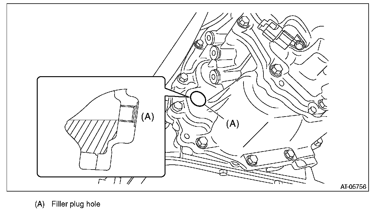 Note that when CVTF is added up to the lower section of filler plug while the transmission is in cold condition, overfilling of CVTF occurs, causing the oil to spill out.