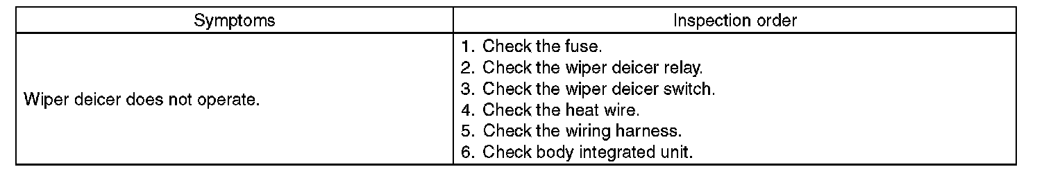 - The wiper deicer does not operate when the ambient temperature becomes 5 °C (41 °F) or more.