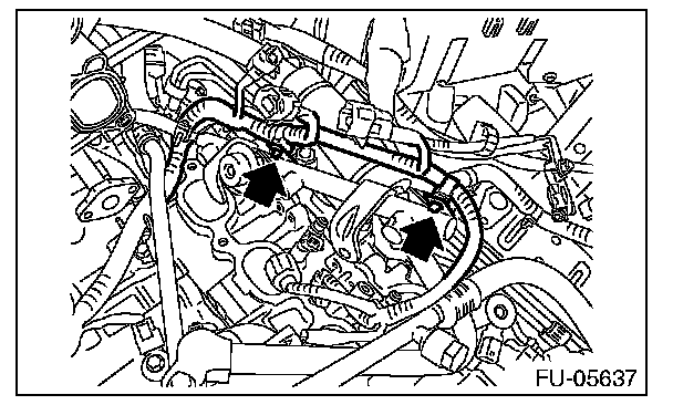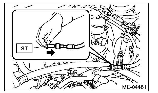 1. Attach ST to the fuel delivery pipe and push ST in the direction of arrow mark to disconnect the quick connector of the fuel delivery hose.