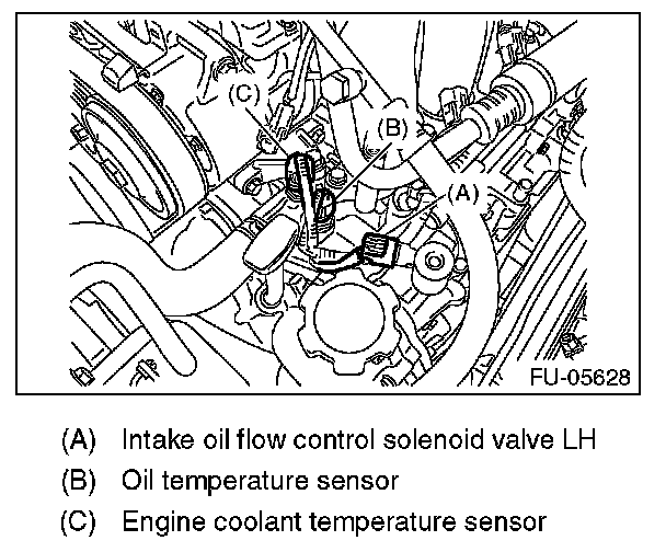 10. Connect the connectors of the oil temperature sensor, engine coolant temperature sensor and intake oil flow control solenoid valve LH.