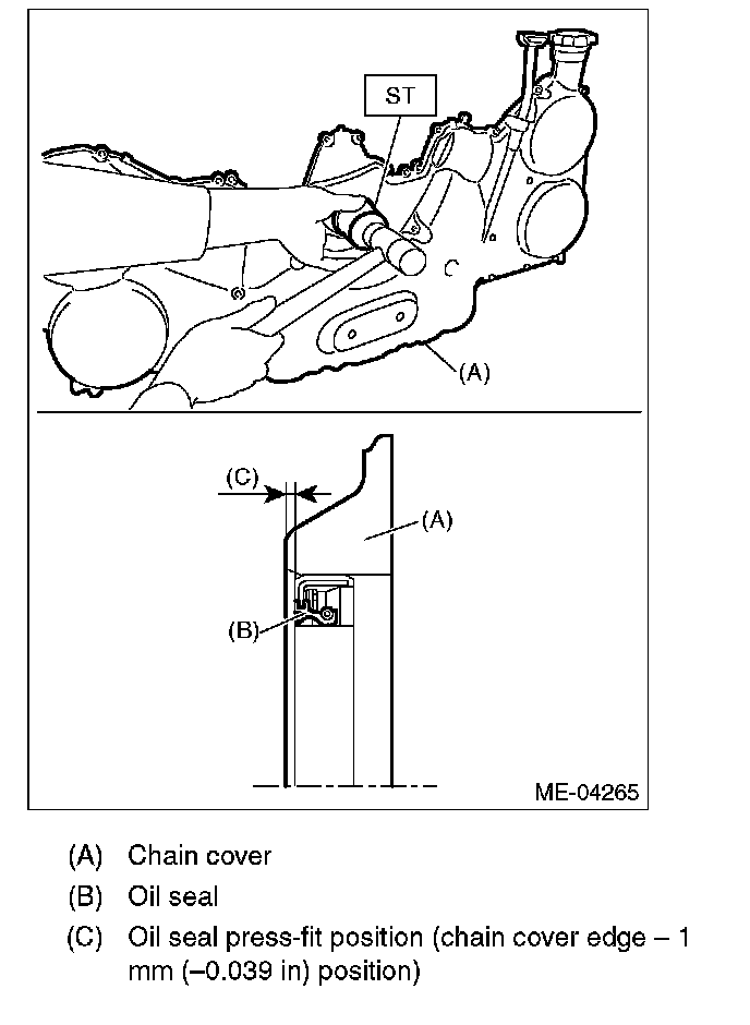 2) Check for oil leakage on the chain cover mating surface and installation part of crank pulley. If there is an oil leak from the oil seal, perform replacement with a new oil seal.