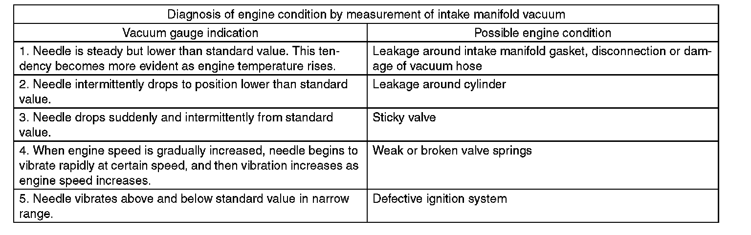 Condition of engine inside can be diagnosed by observing the behavior of the vacuum gauge needle as described in table below.