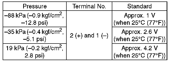 NOTE: When vacuum occurs at the pressure port of manifold absolute pressure sensor, the voltage will drop from the value as in step 3). When positive pressure occurs, on the other hand, the voltage will rise.