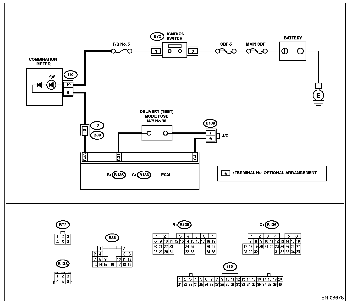 Although malfunction indicator light comes on when the engine runs, DTC is not shown on the Subaru Select Monitor or general scan tool display.