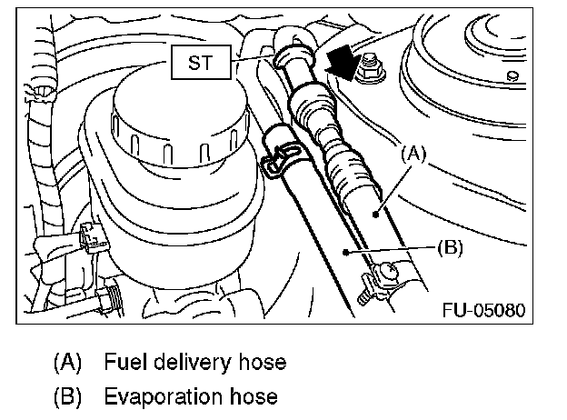 3. Disconnect the quick connector of the fuel delivery hose by pushing the ST in the direction of the arrow.
