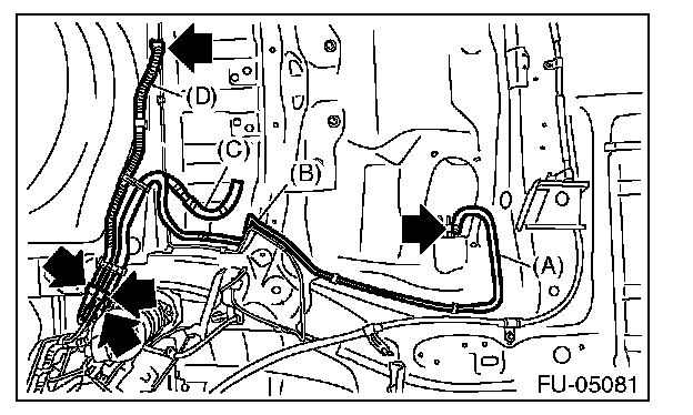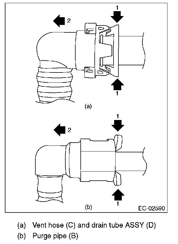 7. Remove the purge hose (A), purge pipe (B), vent hose (C) and drain tube assembly (D).
