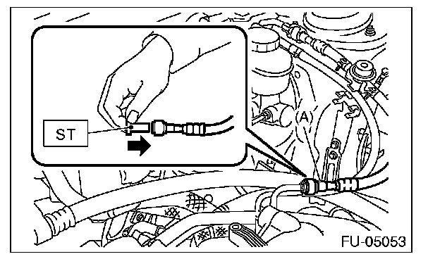 3. Attach ST to the fuel delivery pipe and push ST in the direction of arrow mark to disconnect the fuel delivery hose (A).