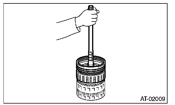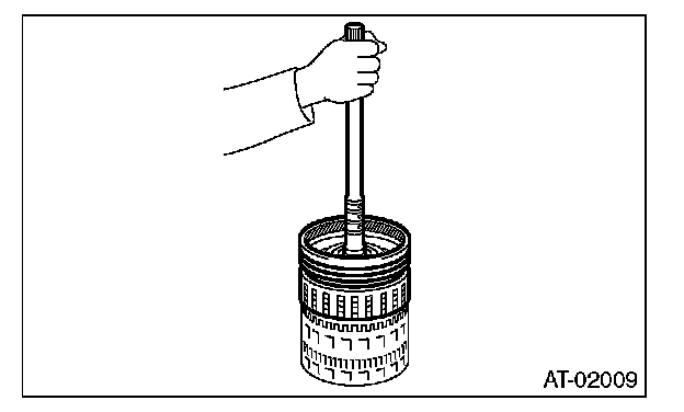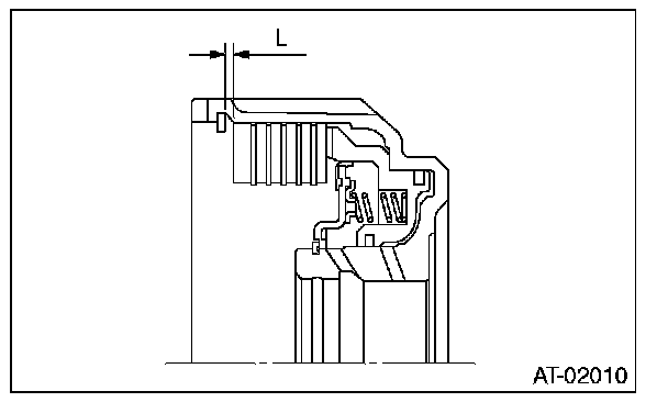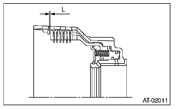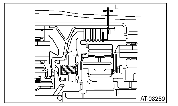 ^ Check the clearance of the input clutch. Measure the clearance "L" between snap ring and retaining plate using a thickness gauge. If it is out of specification, replace the entire input clutch assembly.