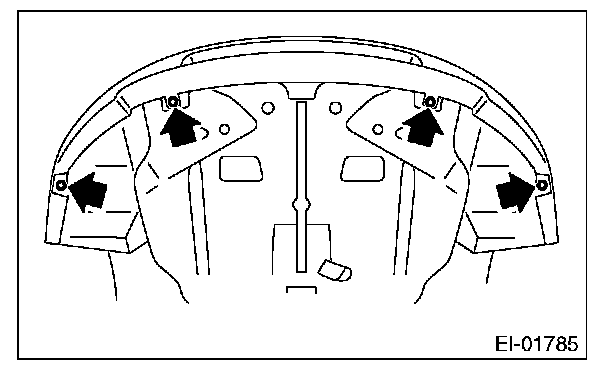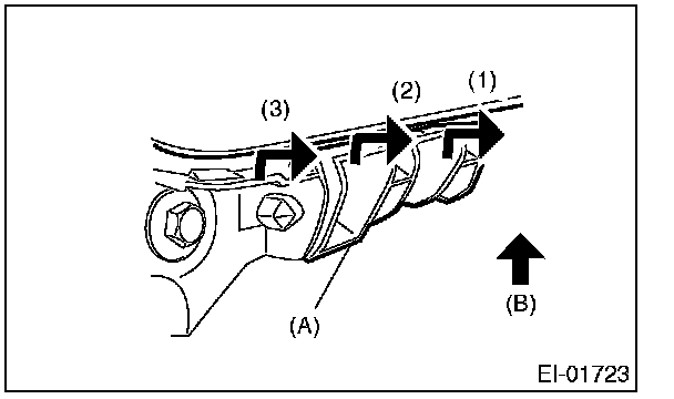 NOTE: It is easier to detach them from the fender side in the order from (1) to (3), while pulling up the bumper face to the direction of arrow (B) (upward).