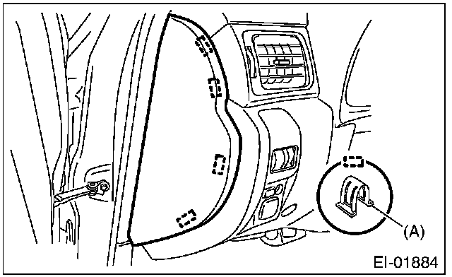 5. Detach the plastic hook (A), and remove the instrument panel side cover RH.