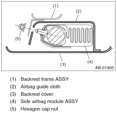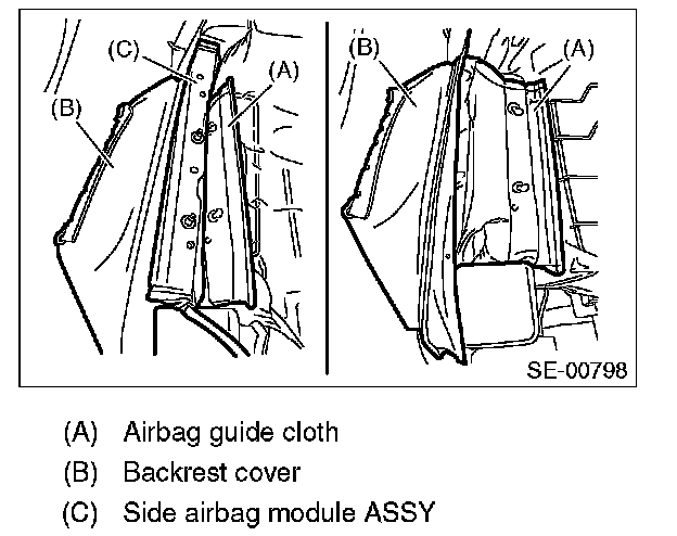 CAUTION: When installing the side airbag module assembly, be sure to put the side airbag module between backrest cover and airbag guide cloth.