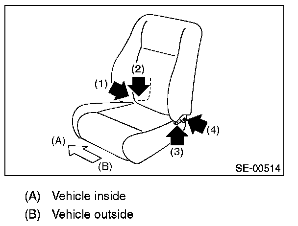 4. Temporarily tighten the reclining hinge bolts in the order of (1) through (4) to an extent that the seat backrest assembly is not held securely.