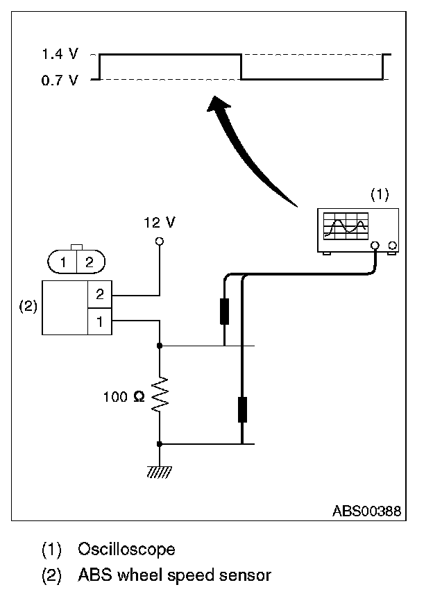 2) Connect a 12 V power supply to No. 2 terminal of sensor connector as shown in the figure, then attach resistance to the No. 1 terminal. Rotate the wheel at about 2.75 km/h (2 MPH), and measure the voltage using an oscilloscope.