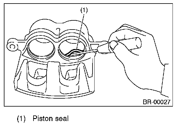 2) Apply a coat of brake fluid to piston seal and install the piston seal to the caliper body groove.