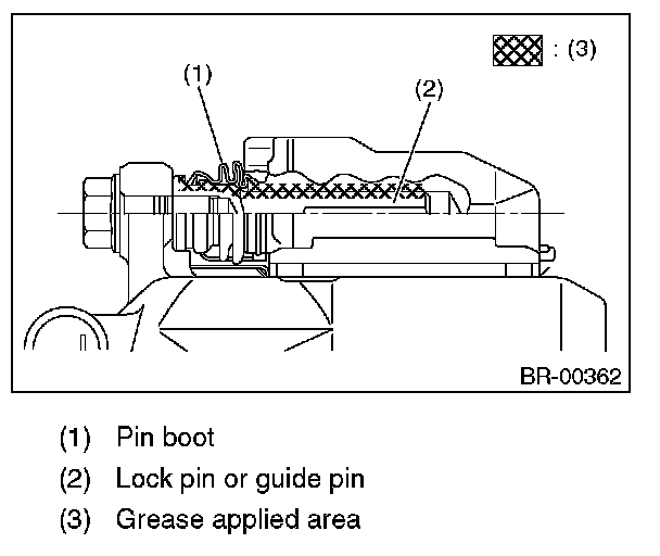 7) Apply NIGLUBE RX-2 (Part No. 000041000) or grease contained in the piston seal kit to the lock pin, guide pin outer surface, cylinder inner surface, and boot grooves.