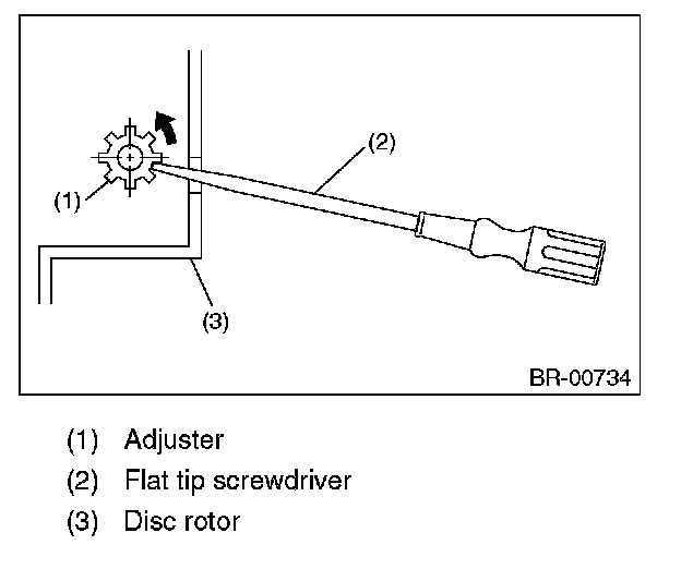 (1) Turn the adjuster using a flat tip screwdriver until the brake shoe is far enough away to allow removal of the disc rotor.