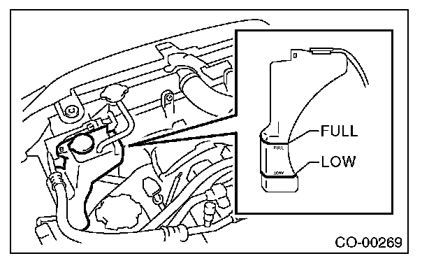3) Fill engine coolant into the reservoir tank up to "FULL" level.