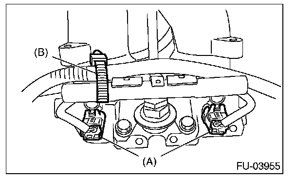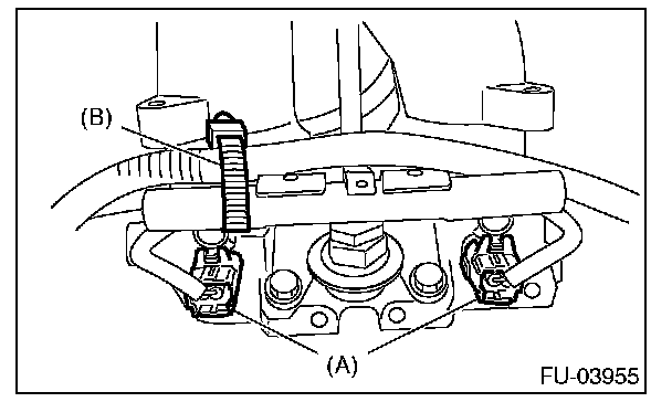 8. Remove the harness band (B) which holds the engine harness to the fuel injector pipe, and disconnect connectors (A) from the fuel injector.