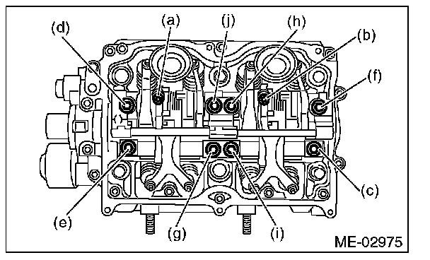 Leave two or three threads of bolts (i) and (j) engaged in order to retain the valve rocker assembly.