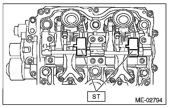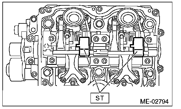^ Set the ST in the position shown in the drawing to mount the intake valve rocker assembly.
