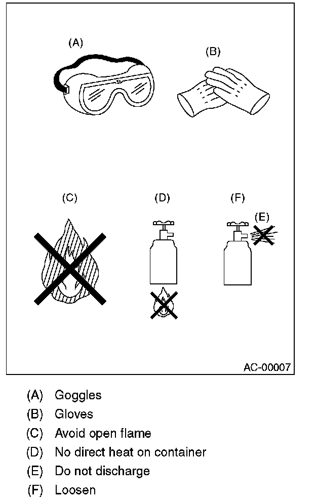 When handling it, be sure to wear protective goggles and protective gloves. Direct contact of the refrigerant with skin may cause frostbite.
