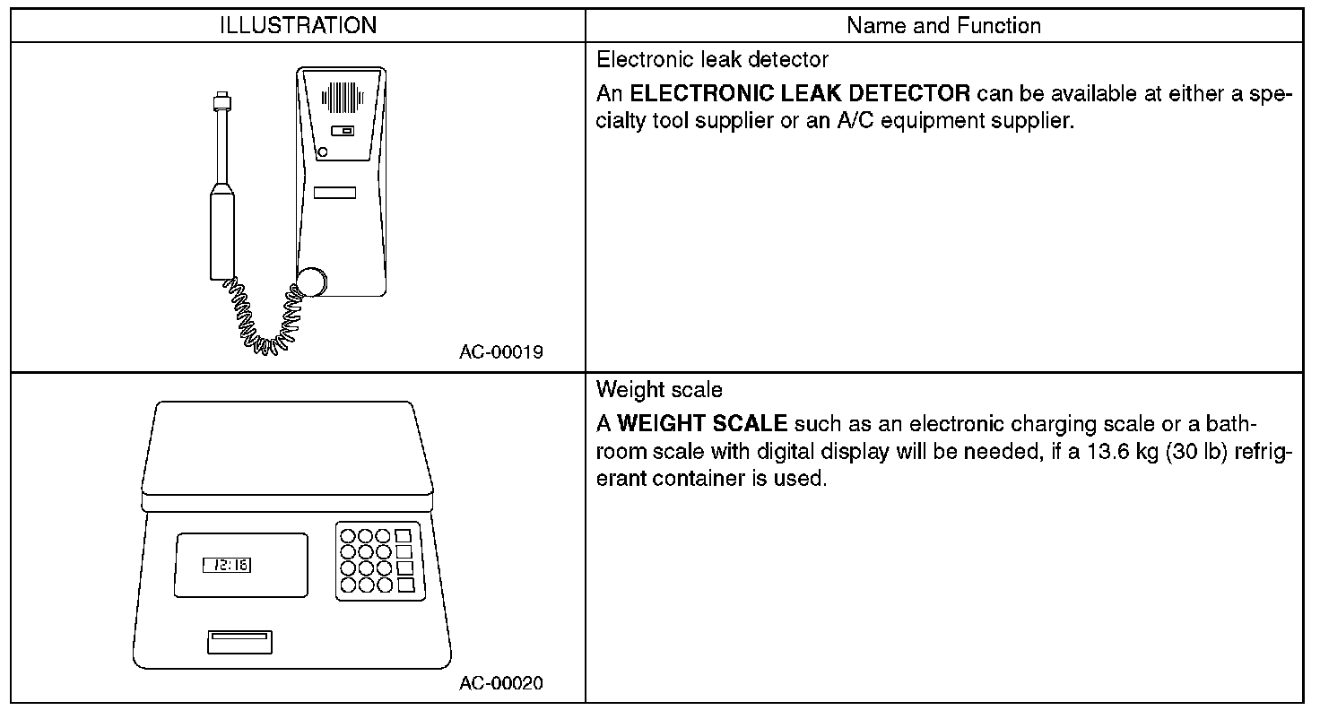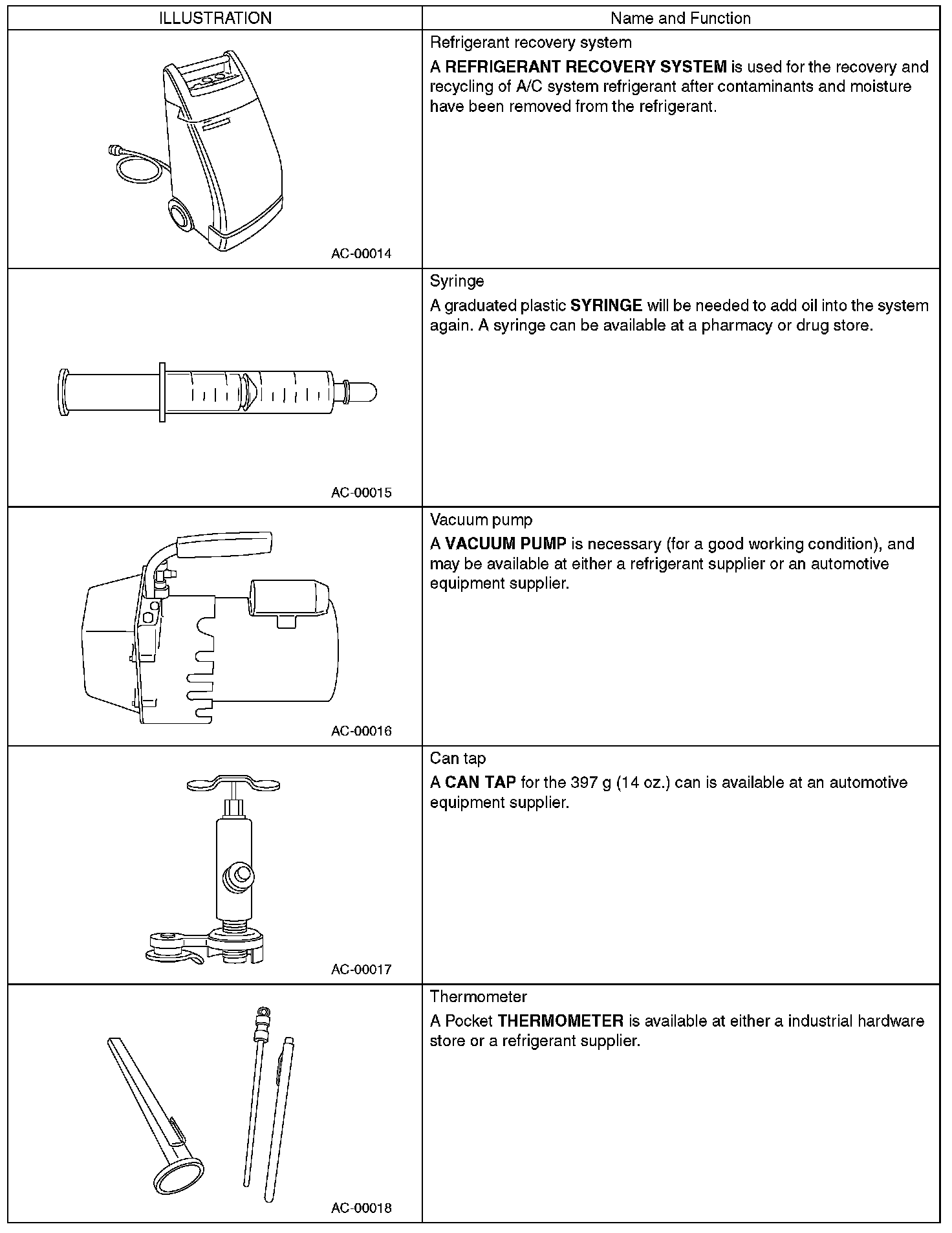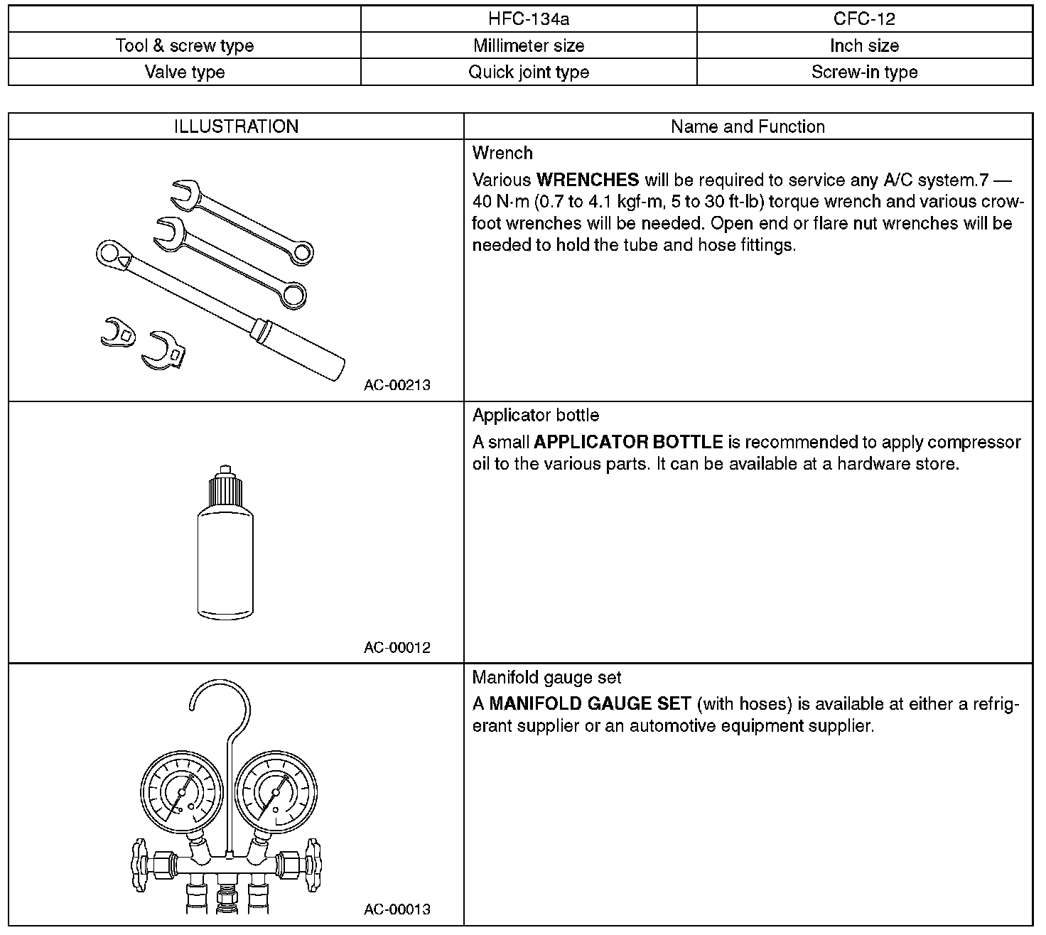 In order to prevent the mixture of HFC-134a and CFC-12 parts and liquid, the type of tool and screw, and the replacement valves used are different. The gas leak detectors for the HFC-134a and CFC-12 systems must also not be interchanged.