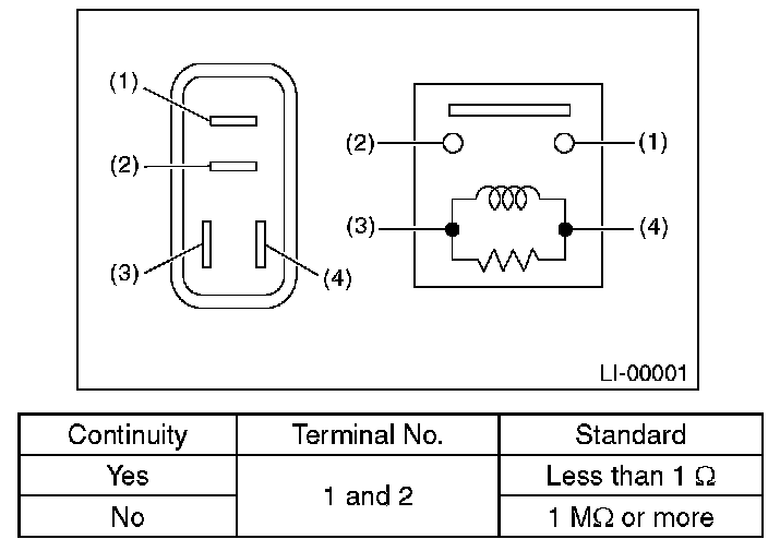 1. Connect terminal No. 4 to the battery positive terminal and the terminal No. 3 to the battery negative terminal, and check the resistance value between the front fog light relay terminals.