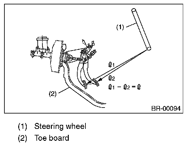 Run the engine at idle after warming up the engine, and depress the brake pedal with a force of 500 N (51 kgf, 112 lbf). Measure the distance between the brake pedal and steering wheel. Release the pedal, and measure the distance between pedal and steering wheel again.