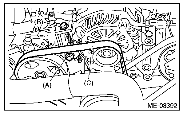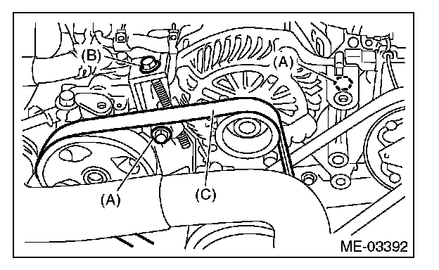 2) Install the front side belt (C), and adjust the slider bolt (B) so as to obtain the specified belt tension.