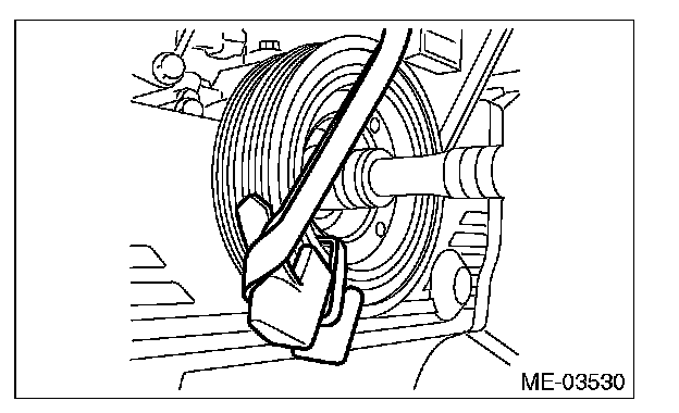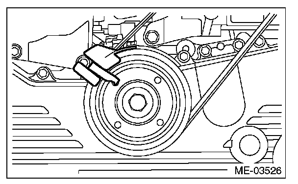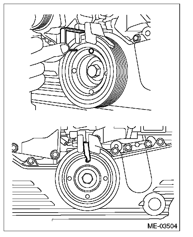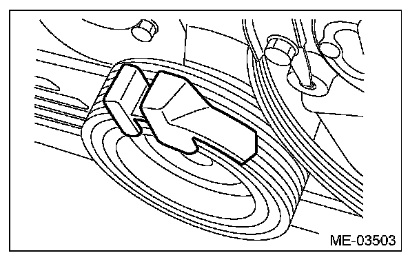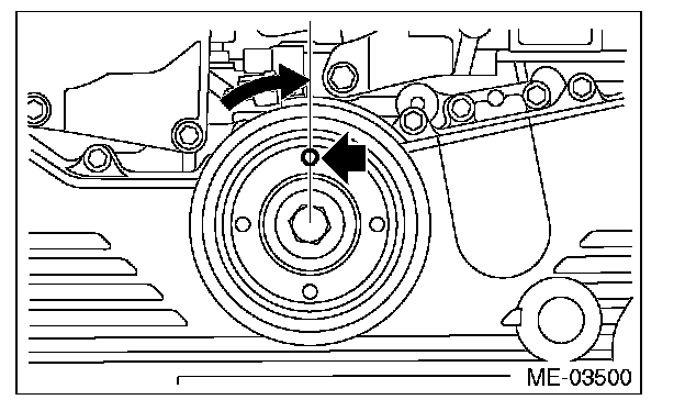 3) Slowly turn the crank pulley clockwise so that the service hole of the crank pulley comes around the top.