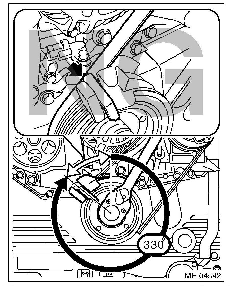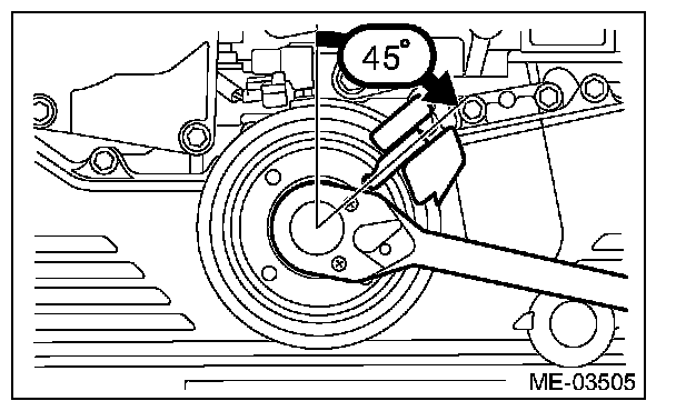 8) Slowly turn the crank pulley clockwise until the belt guide comes to approximately 45°.