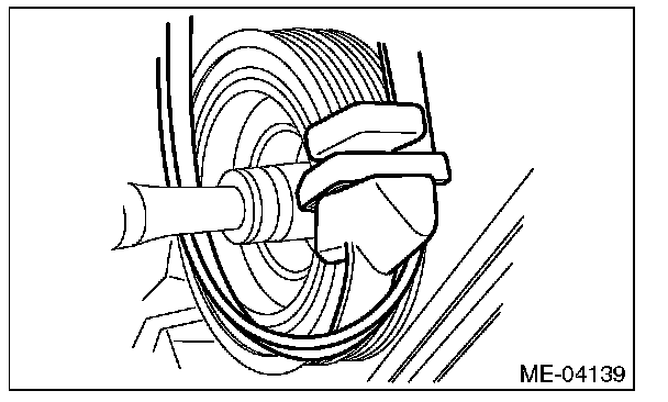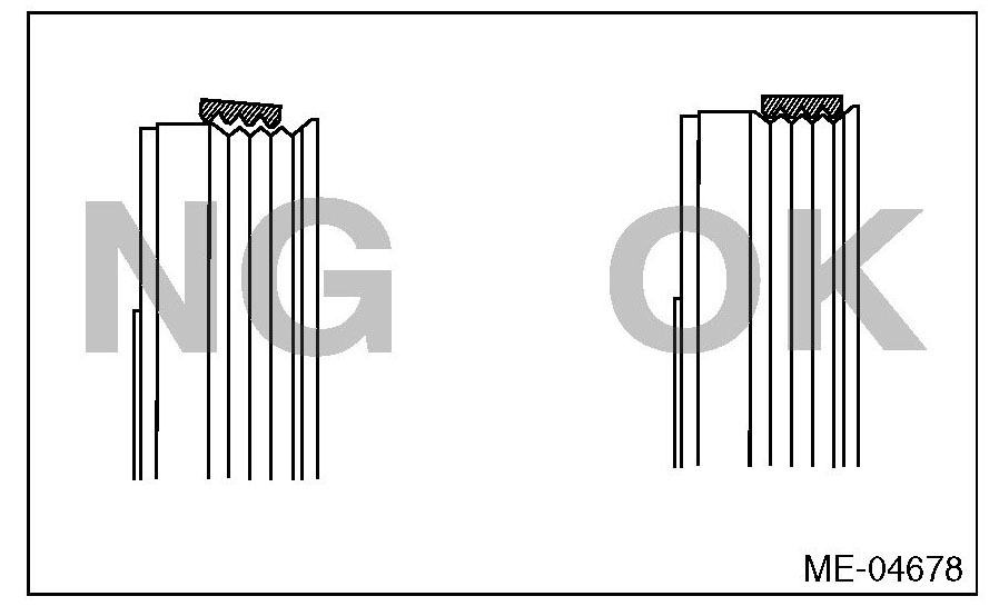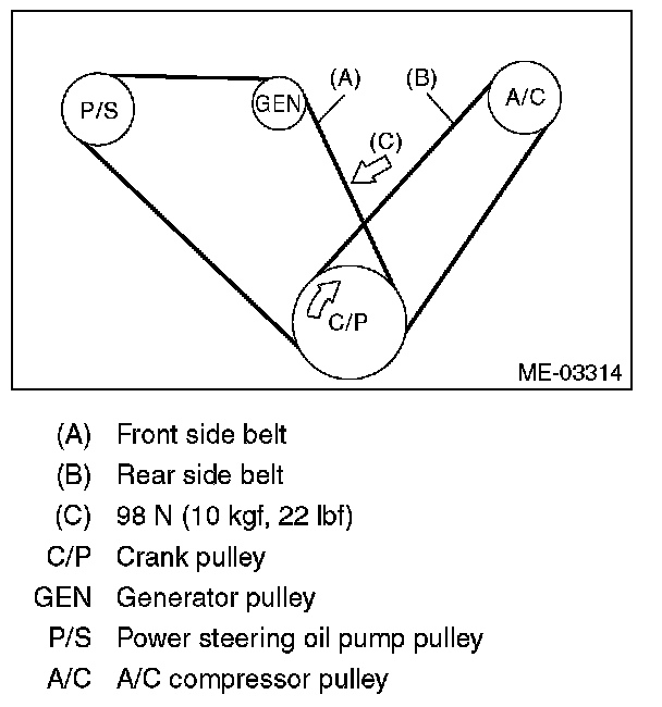^ If the front side belt tension is lower, the front side belt and crank pulley slip, causing abnormally high temperature on the crank pulley due to frictional heat. If this condition repeatedly occurs, the front side belt may abnormally wear, causing abnormal noise, front side belt damage or crank pulley damage.