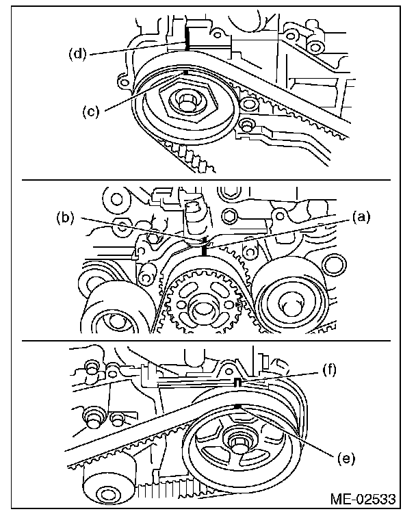 (1) Use the ST to turn crankshaft. Align the mark (a) of sprocket to the mark (b) of oil pump, and then ensure the right side cam sprocket mark (c), cam cap and cylinder head matching surface (d) or left side cam sprocket mark (e), timing belt cover notch (f) are properly adjusted.