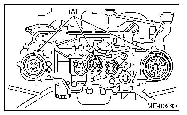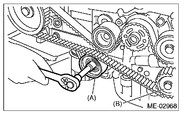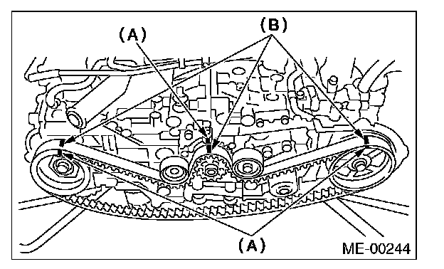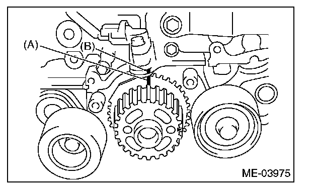 4) While aligning the alignment mark (B) on timing belt with the mark (A) on sprockets, position the timing belt properly.