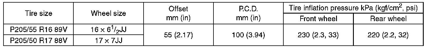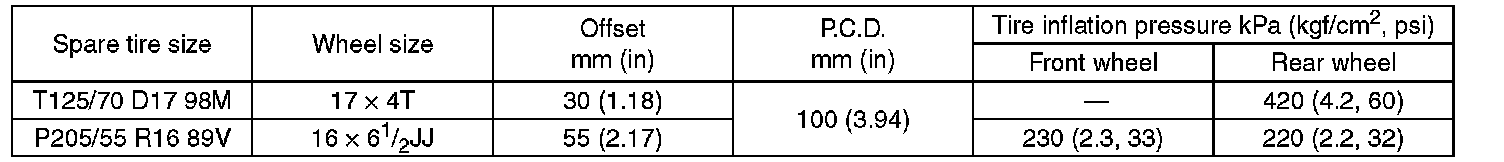 Size and inflation pressure of the standard equipment tire and spare tire are described on the "Tire inflation pressure" label attached to the body side of the driver's door.